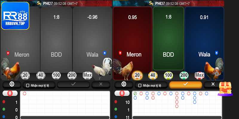 Người chơi khi tham gia Đá Gà RR88 sẽ có ba lựa chọn quen thuộc gồm Meron, Wala và Hòa. Mỗi cửa đặt mang đến tỷ lệ thưởng và rủi ro khác nhau, phù hợp cho từng chiến lược cá cược.
